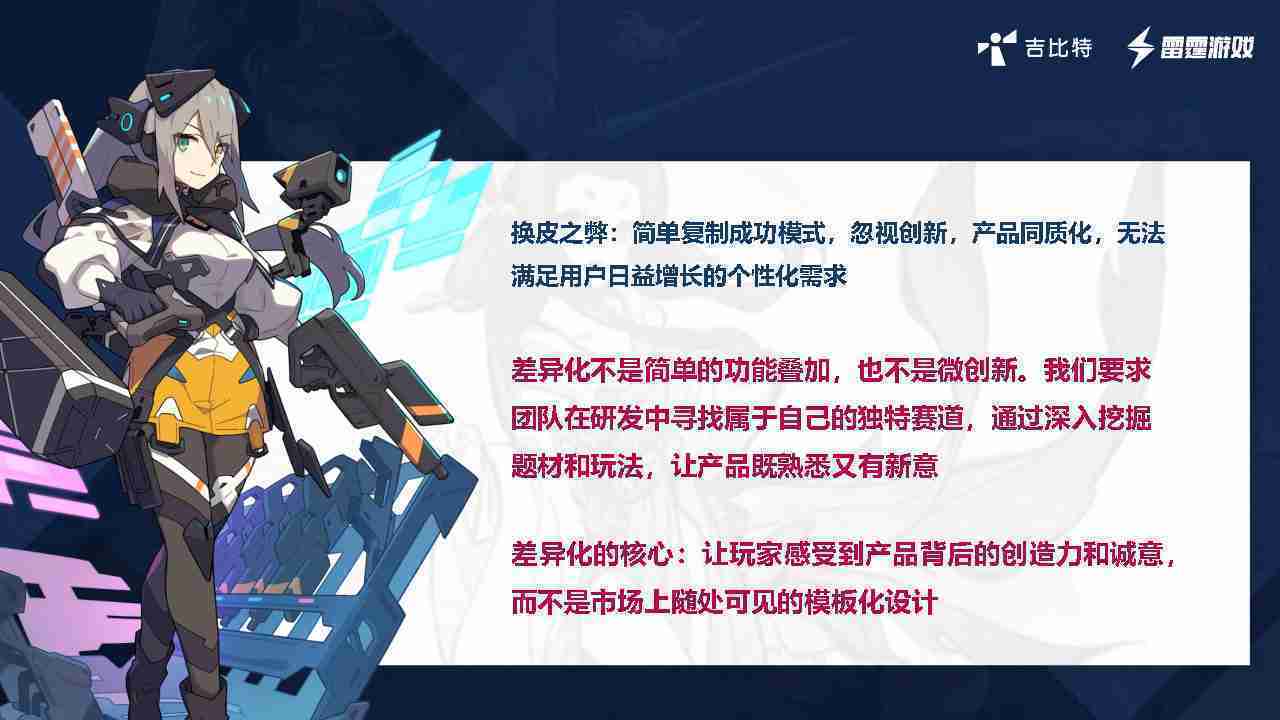 在我们内部是这么定义差异化的。。首先,,,,差异化不是简单的功能叠加,,,,更不是换皮。。。只是换皮,,产品无法提供有效的市场价值。。内部经常说差异化的产品不是为了迎合市场,,而是找到一个自己独特的表达方式,,,,在研发中找到属于自己的细分赛道和独特赛道,,前提是需要对这个题材有足够的深入、、、挖掘,,,对玩法有足够深入的理解,,,,让产品看起来既熟悉又有新意。。