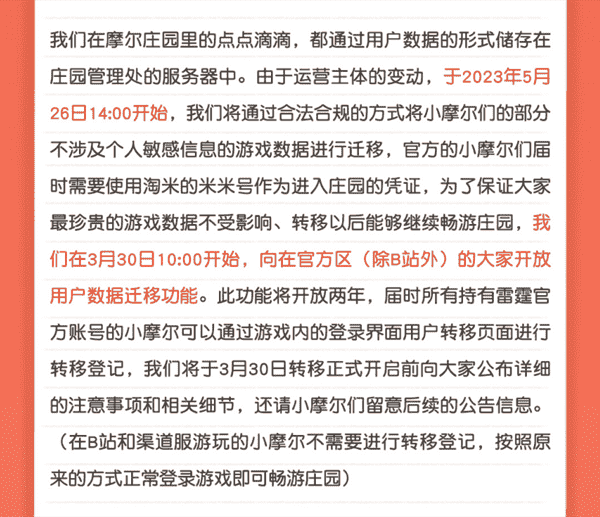 合作结束本就是开发方和代理方双方的事情,,,,降低这件事情对玩家的影响,,,,才是对所有珍视这段童年的摩尔玩家最好的呵护。。目前看来,,用户完全不用担心后续因无法登录游戏而造成任何数据上的损失,,只要及时进行账号转移,,就可以好好保留、、、、延续在庄园的痕迹和回忆,,,,继续在庄园里做快乐的红鼻子小鼹鼠。。