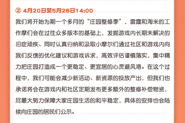 合作的结束并不意味着这个童年IP的结束,,对于《摩尔庄园》手游而言,,,这是一个新阶段的开始。。后续游戏内将开启庄园重构计划,,,会就以往遗留下来的BUG进行集中修复,,,并在游戏内和社区定期发布更多补偿物资。。。。