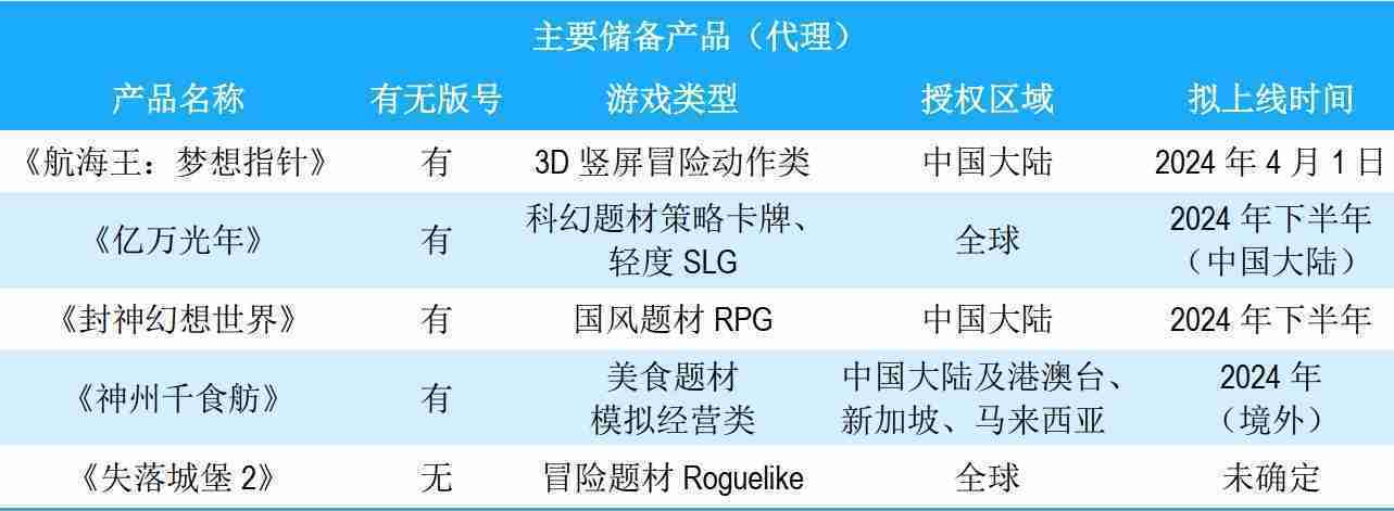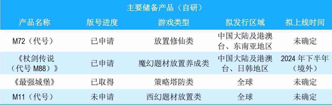 公司储备的多个自研、、、、代理产品都在有序推进当中,,涵盖放置类、、、、策略类、、模拟经营类、、、RPG、、、Roguelike等多元化游戏品类,,储备的主要自研和代理产品如下:::